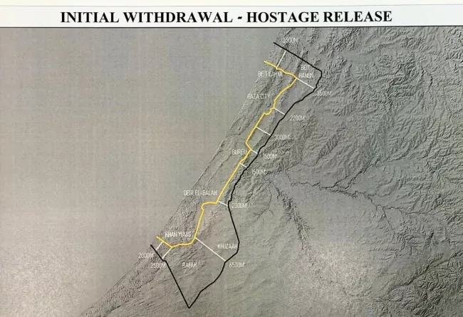 A map of the initial withdrawal line of the Israeli occupation army from the Gaza Strip proposed by Trump's administration, Oct. 4, 2025President Donald Trump claimed Saturday on Truth Social that Israel had agreed to an initial withdrawal corridor as part of the plan’s first phase. He shared a map showing the designated zones, which excluded Rafah, the Philadelphi corridor, and Beit Hanoun.