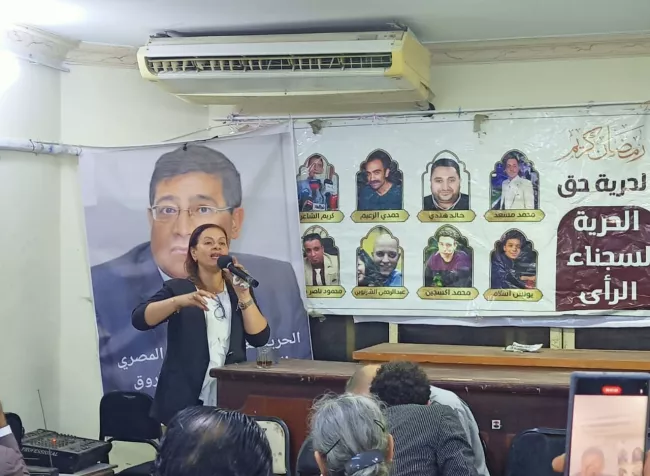 Naglaa Salama, wife of researcher and economic expert Abdelkhalek Farouk, speaks during the launch of the Committee for the Defense of Prisoners of Conscience at the Al-Karama Party HQ, Nov. 10, 2025. Farouk was arrested at his home on Oct. 20, 2024, and referred to State Security prosecutors. He faces charges of “joining and financing a terrorist group” and “spreading false information”. Rights groups have remarked that these charges were triggered by his publication of 40 articles criticizing government economic policies.