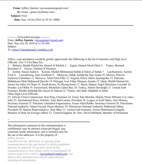 By Oct. 24, 2010, Epstein received a similar email, with more high-level names added onto the list of forum invitees. The conference would now include then-Secretary General of the Arab League, and international adviser to IPI Amre Moussa, PA leader Mahmoud Abbas, Jordanian FM Nasser Judeh, and former British PM Tony Blair as a representative of the Quartet .