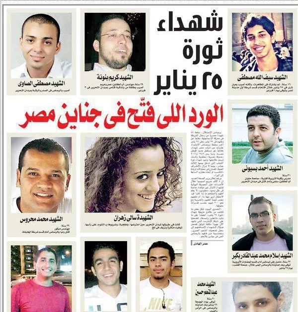 Years passed, and the revolution left its mark on our home. One day, my father brought back a poster and hung it on our door. At its center were the words “The flowers that bloomed in Egypt’s gardens,” surrounded by the faces of young people. I used to stand in front of that poster for long stretches, studying the faces, names, and ages. What astonished me most was how young they were—most were in their twenties.