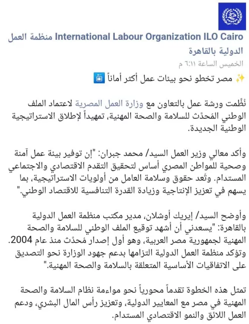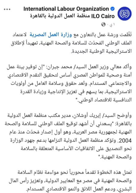 البيان المحذوف لمنظمة العمل الدولية بالقاهرة، 16 أبريل 2025كما أقدمت المنظمة على تعديل بوست آخر يتحدث عن ورشة عمل بالتعاون مع وزارة العمل المصرية، لاعتماد الملف الوطني للسلامة والصحة المهنية، حيث حذفت من المنشور جملة "مصر تخطو نحو بيئات عمل أكثر أمانًا"، وذلك بعد نصف ساعة من نشره.