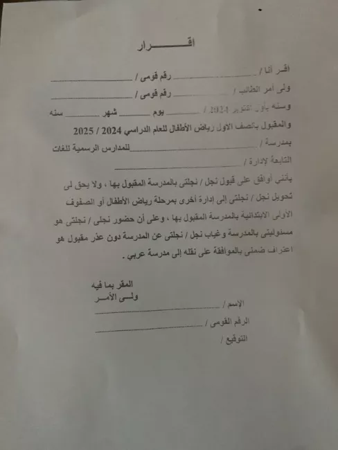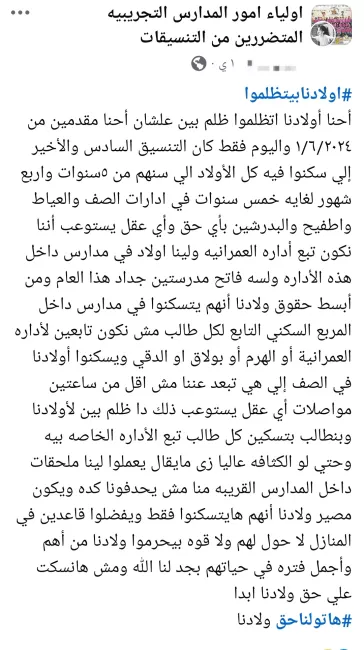 إقرار ولي الأمر ضمن أوراق التقدم للمدارس التجريبيةوأصدروا بيانًا على فيسبوك استنكروا فيه تعرض أبنائهم لظلم بيّن بسبب تعنت مديرية التربية والتعليم، حسب تعبيرهم، وتسكينهم بفصول ملحقة في مناطق نائية، وقالوا إنهم تقدموا للالتحاق بالمدارس التجريبية في الأول من يونيو 2024 ولم يقبلوا سوى في التنسيق السادس الذي ظهر يوم الخميس الماضي، وتفاجأوا بتسكينهم في إدارات الصف والعياط وأطفيح.