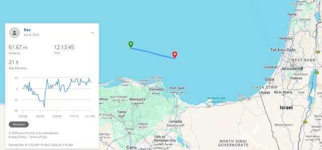 وبمراجعة لينك تتبع السفينة مادلين، كان آخر موقع وصلت إليه في المياه الدولية بمحازاة محافظة بورسعيد، شمال مصر، وانقطع البث منتصف الليلة الماضية.