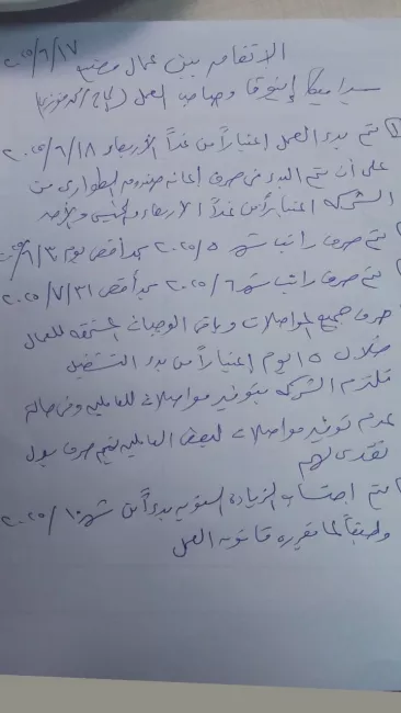 وأضاف العامل، الذي طلب عدم نشر اسمه، أن العرض تضمن أيضًا وعدًا بصرف بدل المواصلات والوجبات المتأخرة خلال 15 يومًا من بدء العمل، مشيرًا إلى أن المدير الإداري للشركة محمود جمعة كتب ورقة بخط يده على شكل اتفاق بين الإدارة والعمال، تضمن ما جاء في العرض، لكن العمال مزقوا الورقة رافضين ما جاء فيها.