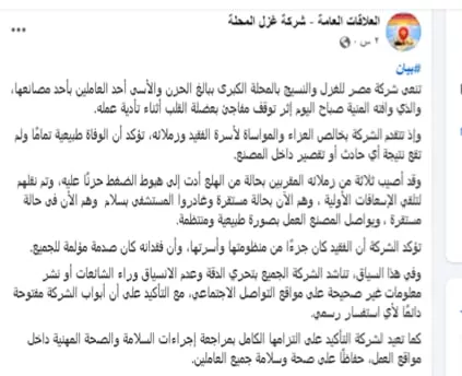 وأصدرت إدارة الشركة، بيانًا على صفحة العلاقات العامة بشركة غزل المحلة على فيسبوك حذفته لاحقًا، قالت فيه إن الوفاة بسبب "توقف مفاجئ بعضلة القلب أثناء تأدية عمله"، وأن الثلاثة المصابين "من زملائه المقربين" وأن إصابتهم نتيجة "حالة من الهلع أدت إلى هبوط الضغط حزنًا عليه، وتم نقلهم لتلقي الإسعافات الأولية وهم الآن بحالة مستقرة وغادروا المستشفى بسلام".