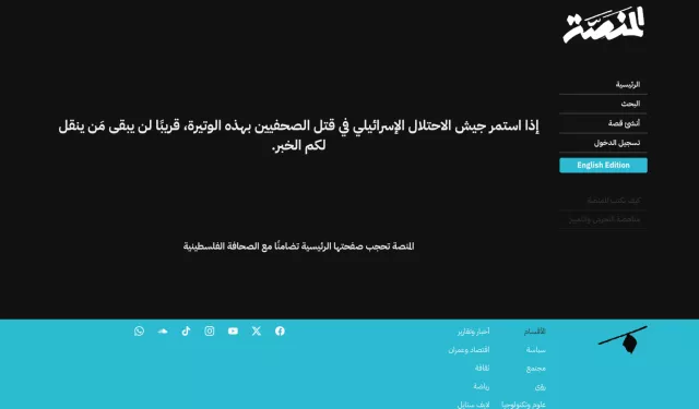 وفي افتتاحيتها عن حجب صفحتها الرئيسية تضامنًا مع الصحافة الفلسطينية، قالت المنصة إن إسرائيل "تحرصُ على تحديثِ سجلّها الإجراميِّ وإثقالِه بالدّماء. في الحربِ الأخيرةِ على قطاعِ غزةَ، أضافتْ الإبادةَ الجماعيةَ والتهجيرَ والتجويعَ المتعمّدَ إلى ما ترتكبه من جرائمَ فصلٍ عنصريٍّ واحتلالٍ استيطانيٍّ توسُّعيٍّ. ولمحاولةِ التغطيةِ على ذلك كلِّه، اقتضى الأمرُ أن تقصفَ كُلَّ قلمٍ، وتَحطم كلَّ كاميرا، وتُسْكِت كُلَّ صوت. اقتضى الأمر أن تقتل الصحفيين".