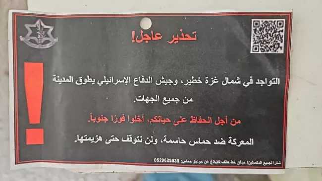 جيش الاحتلال يدعو الفلسطينيين في غزة للنزوح جنوبًا، 4 أكتوبر 2025وألقت الطائرات الإسرائيلية منشورات على مناطق وسط وغرب المدينة، تتضمن تحذيرًا من "التواجد في شمال القطاع" باعتباره "يشكل خطرًا على الحياة"، مطالبة السكان بالنزوح فورًا، ومؤكدة استمرار العمليات العسكرية حتى "القضاء على حركة حماس"، حسب المنشور.