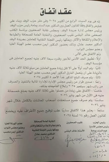صحفيو الوفد مع نقيب الصحفيين خالد البلشي عقب عقد اتفاق مع رئاسة الحزب على تطبيق الحد الأدنى للأجور، 4 أكتوبر 2025