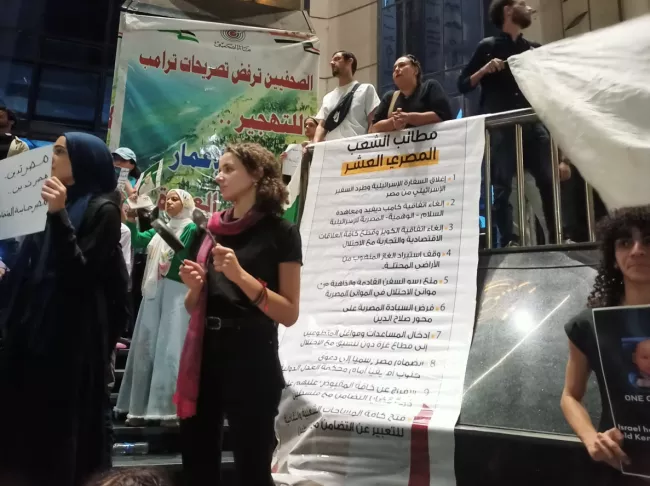 ورفع المشاركون خلال الوقفة لافتات تطالب بوقف العدوان وفتح المعابر لإدخال المساعدات الإنسانية إلى غزة، كما حملت إحدى المشاركات قائمة من عشرة مطالب أبرزها إغلاق السفارة الإسرائيلية في القاهرة، وإلغاء اتفاقية الكويز التي تشترط وجود مكوّن إسرائيلي في بعض الصادرات المصرية، إلى جانب المطالبة بكسر الحصار وإدخال المساعدات والإغاثة العاجلة إلى قطاع غزة.