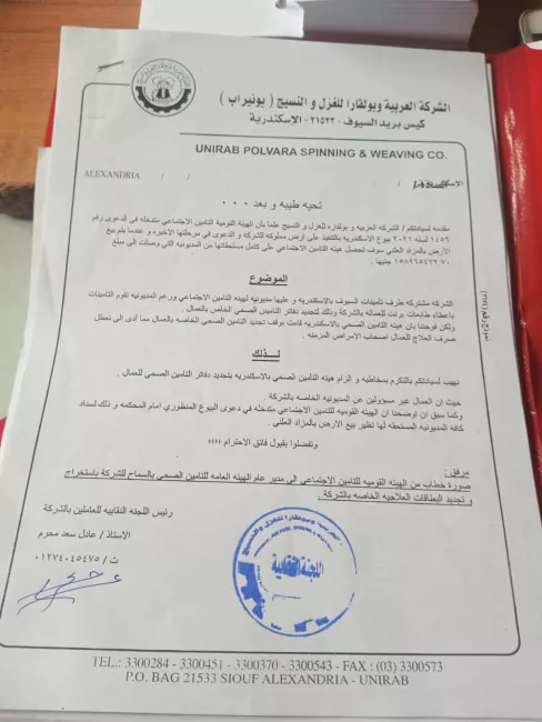 صورة من شكوى اللجنة النقابية بعد وقف الخدمات العلاجية للعمالوأشار محرم إلى أن إدارة الشركة تعاقدت بمعرفة اللجنة النقابية مع طبيب جديد لتوقيع الكشف على العمال ثلاثة أيام أسبوعيًا، على أن تقوم الشركة بصرف روشتات العلاج على نفقتها عن طريق مندوب، وتسليم العلاج للمرضى، حتى حل الأزمة مع الهيئة القومية للتأمين الاجتماعي واستئناف الخدمات العلاجية.