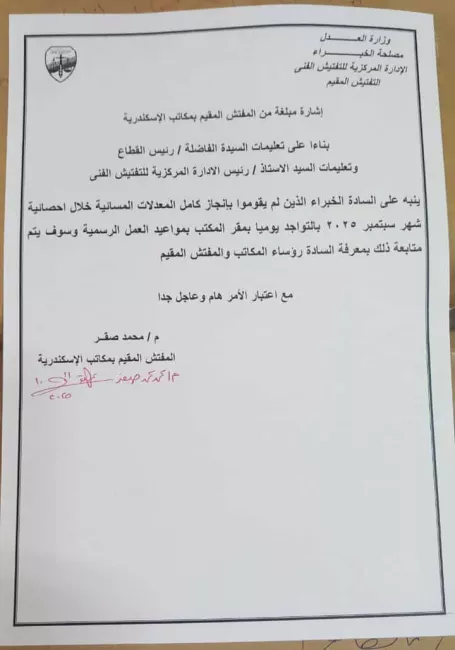 وأضاف، طالبًا عدم نشر اسمه، أن مساعد الوزير لشؤون الخبراء أعطى تعليماته أمس بإصدار قرارات إدارية من المفتشين المقيمين بالمكاتب في المحافظات المختلفة، بإلغاء التناوب للخبراء الذين لم يحققوا المعدلات المسائية خلال شهر سبتمبر، ما اعتبره الخبراء عقابًا لهم على الإضراب التباطئوي.