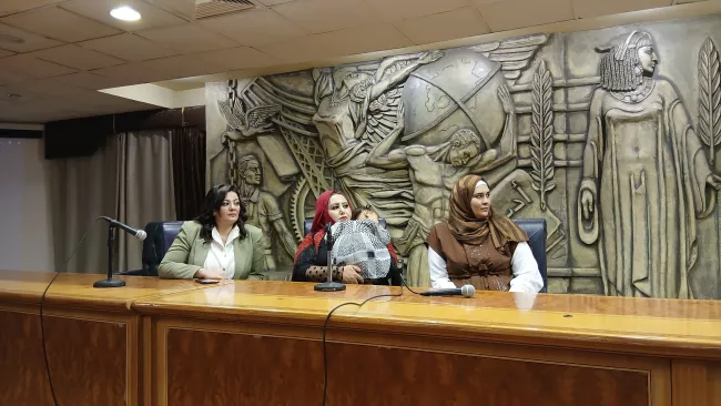 جانب من احتفالية نقابة الصحفيين بيوم المرأة الفلسطينية، 26 أكتوبر 2025وتحكي أمارة الأخرس (26 عامًا)، إحدى المصابات الفلسطينيات التي تُقيم في مصر للعلاج منذ نوفمبر/تشرين الثاني 2023، عن فقدانها 35 فردًا من عائلتها خلال العدوان على غزة.