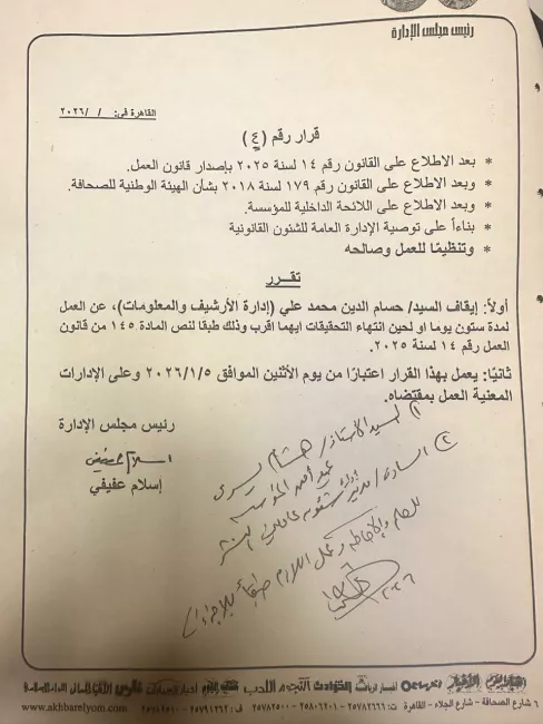 أوقف رئيس مجلس إدارة مؤسسة أخبار اليوم إسلام عفيفي، الصحفي حسام الدين محمد علي، وشهرته حسام الكاشف، وستة من عمال مطابع المؤسسة عن العمل لمدة شهرين، لحين الانتهاء من التحقيق معهم على خلفية وقفة احتجاجية نظمها عمال المطابع الأحد الماضي، ونشر عنها الكاشف تدوينة على صفحته الشخصية في فيسبوك.