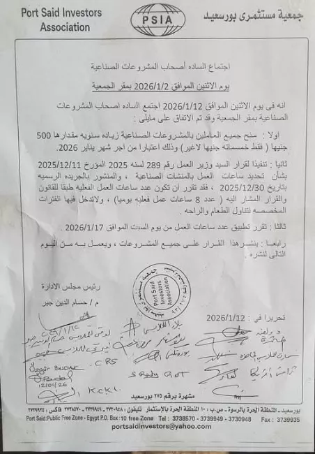 ونص قرار جمعية المستثمرين الصادر بتاريخ 12 يناير/كانون الثاني 2026، على منح العاملين بالمشروعات الصناعية زيادة سنويه مقدارها 500 جنيه، كمبلغ مقطوع يضاف إلى الراتب ابتداء من شهر يناير 2026، على أن يتم تشغيل العاملين "8 ساعات عمل فعلية يوميًا، لا تدخل فيها الفترات المخصصة لتناول الطعام والراحة"، قبل أن يتم تعليق تطبيق القرار بعد ثلاثة أيام من صدوره.