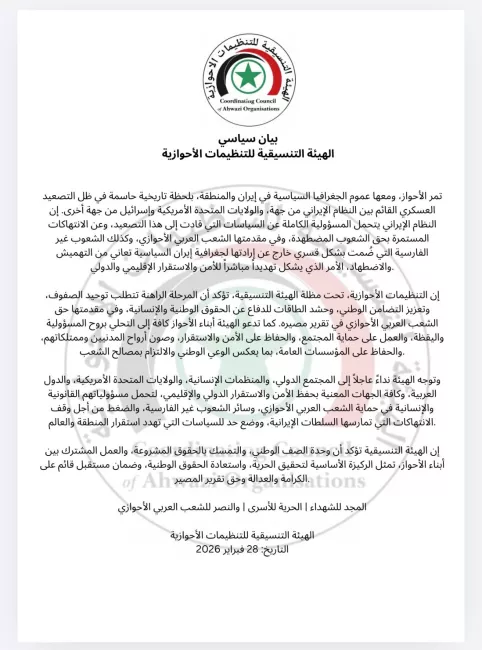 بيان صادر عن تنسيقية التنظيمات الأحوازية، 28 فبراير 2026أمس، وبالتوازي مع العدوان الأمريكي الإسرائيلي على طهران وغيرها من المدن الإيرانية، أصدرت "الهيئة التنسيقية للتنظيمات الأحوازية" بيانًا أكدت فيه أن "الشعوب غير الفارسية ضُمت بشكل قسري خارج إرادتها لجغرافية إيران السياسية، وباتت تعاني من التهميش والاضطهاد، الأمر الذي يشكل تهديدًا مباشرًا للأمن والاستقرار الإقليمي والدولي".