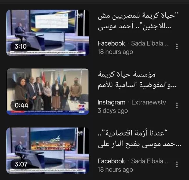 اضطرت إدارة قناة صدى البلد، أمس الاثنين، إلى حذف أكثر من نصف ساعة من الفيديو الخاص بحلقة برنامج "على مسؤوليتي" للإعلامي أحمد موسى، من حسابات القناة على السوشيال ميديا، تضمن هجومًا ساقه موسى على مؤسسة حياة كريمة لتبنيها مبادرة لتمكين اللاجئين اقتصاديًا في مصر بالتعاون مع مفوضية شؤون اللاجئين، حسبما قال مصدران مطّلعان بالقناة لـ المنصة.