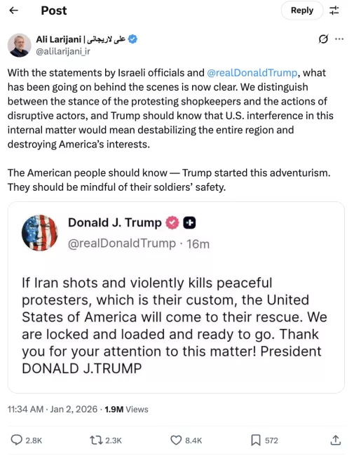 Tweets by Ali Larijani and Donald Trump, Jan. 2, 2026