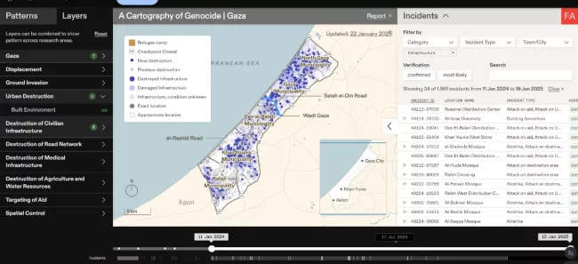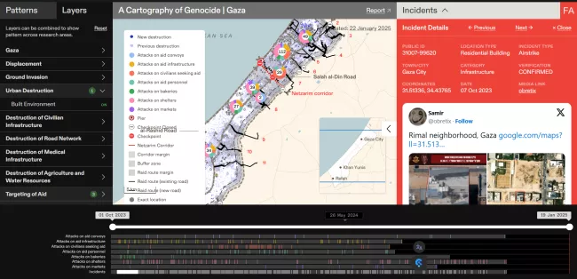 مثلًا، أطلقت مؤسسة Forensic Architecture قاعدة بيانات على شكل منصة تفاعلية تعرض خريطة لقطاع غزة وسجلًا زمنيًا للأحداث الممتدة من 7 أكتوبر/تشرين الأول 2023 حتى 19 يناير/كانون الثاني 2025. تشكل هذه المنصة سجلًا حيًا لجرائم الاحتلال، يتجاوز قدرة أي قاعدة بيانات تقليدية أو ذاكرة الإنسان.