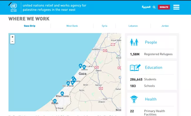 كما هو موضح في الصورة، تتخذ نظمُ المعلومات الجغرافية أداةً من قِبل الأونروا، وذلك من خلال تمثيل البيانات على الخريطة. ستجد عددًا من المُخيمات التي ساهمت الأونروا في تجهيزها وتطويرها لاستقبال اللاجئين، وتحديد ما ينقص تلك المُخيمات من الرعاية الصحية والتعليم والغذاء. وكل ذلك من خلال أدوات تجمع المعلومات وتعرضها وتحللها على تلك الخرائط.
