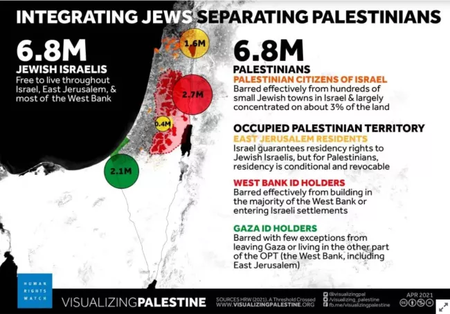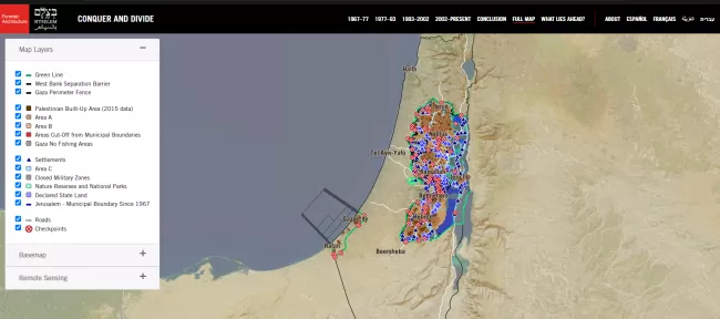 وفي مشروعها سُد وفرّق/Conquer and Divide، أنشأت المنظمة اليسارية الإسرائيلية بِتْسِيلِم خريطة تفاعلية لفلسطين التاريخية، تهدف من خلالها إلى فضح سياسات الاحتلال في تقسيم وتفتيت الشعب الفلسطيني الذي يزيد تعداده عن سبعة ملايين نسمة.