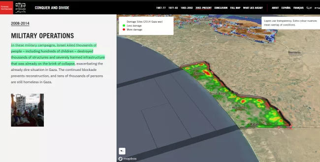 كما تحوي الخريطة مواقع جميع نقاط التفتيش والحواجز التي أقامها الاحتلال، إلى جانب المستوطنات المبنية على أراضي الفلسطينيين، والمناطق التي تسعى إسرائيل للسيطرة عليها في غزة ومحيطها بعد انتهاء الحرب. كما يمكن للمستخدم استعراض سجل مرئي موثّق لانتهاكات الاحتلال وسرقة الأراضي الفلسطينية.