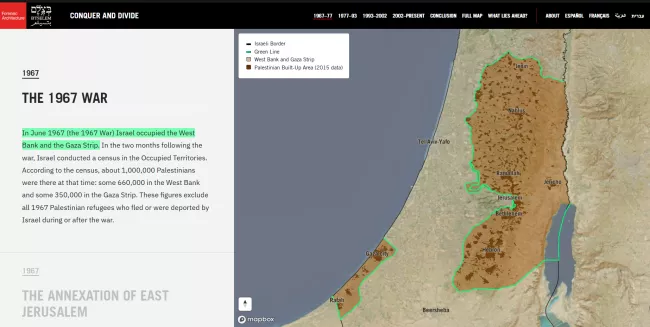 تسعى بِتْسِيلِم من خلال هذا المشروع إلى توثيق كافة جرائم الاحتلال منذ نكسة 1967 حتى اليوم، عبر رواية توعوية مدعومة بالخرائط التي تُظهر تسلسل الأحداث والتطورات. يمكن للمستخدم عبر هذه الخريطة أن يكون في قلب المشهد، متابعًا كيف يواصل الاحتلال تنفيذ مخططاته لتهجير الفلسطينيين من غزة والضفة الغربية.
