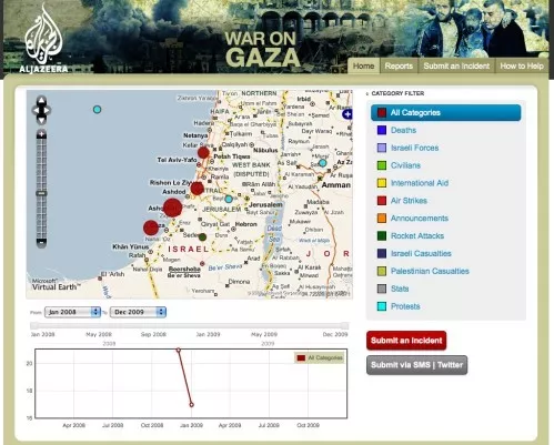 فريق Al Jazeera Labs، مؤسسة الجزيرة للإعلام، هو الآخر تعاون في عام 2009 مع مطوري برمجية أوشاهيدي/Ushahidi، وهي منصة مفتوحة المصدر صُممت لجمع المعلومات من الجمهور وعرضها على خرائط تفاعلية، لاستخدام منصتها في توثيق الأحداث في غزة.
