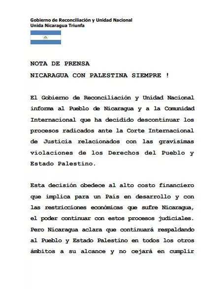 ووسط ضَعف صوت الإعلام الرسمي في ماناجوا ومحدودية تأثيره تحت قيادة حكومة شمولية يسارية منغلقة بزعامة مشتركة لدانييل أورتيجا وزوجته روزاريو موريلو، أعلنت الحكومة مساء الخميس الماضي 10 أبريل/نيسان استئناف الإجراءات والعودة لدعم جنوب إفريقيا، لكن لم يتضح حتى كتابة هذه السطور كيف سيتم ذلك رسميًا.