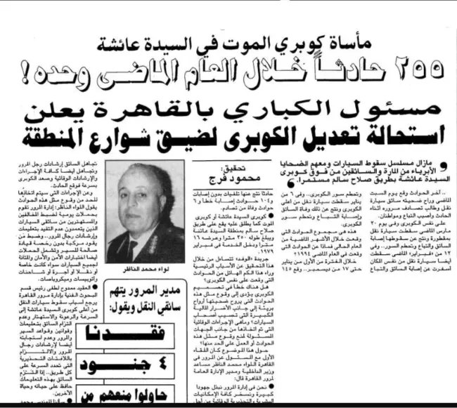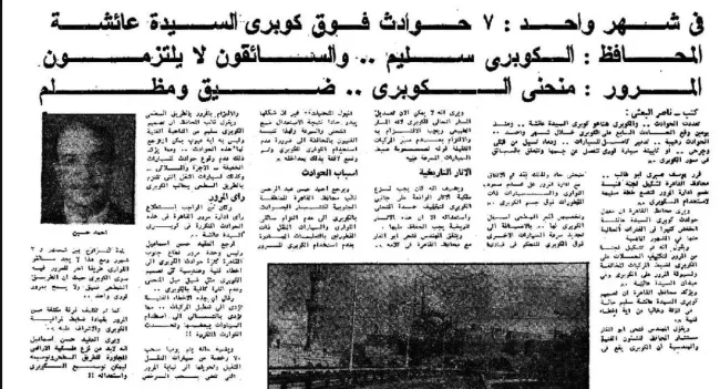 ذهبتْ بنا المعلومة التي ألقى بها الموظف إلى أرشيف الصحف المصرية، لنقف على الكم الهائل لما نُشر عن الكوبري طوال العقود الأربعة الماضية من أخبار وتقارير ترصد حوادثه، مع تعليقات من المحافظ ونوّابه، وأخرى من إدارة المرور.