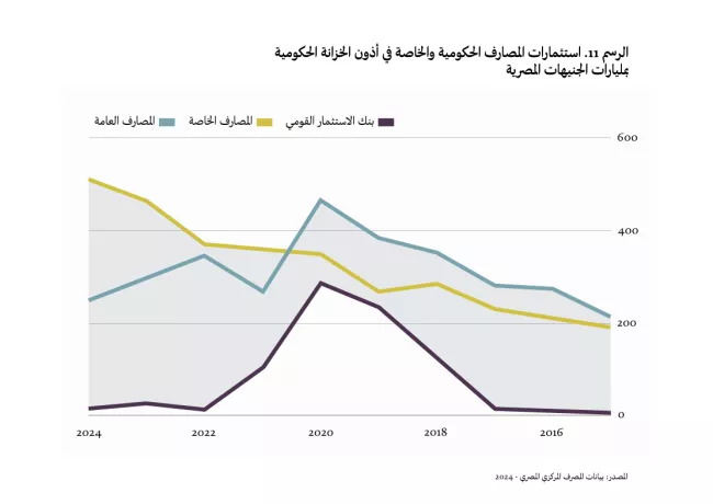 وعلى الرغم من استمرار ملكية الدولة لبنوك تجارية مهيمنة على غرار البنك الأهلي، فإن نصيب البنوك الحكومية من سوق الدين العام كان يتراجع خلال الفترة التي كثفت فيها مصر من اقتراضها من صندوق النقد الدولي، ما زاد من محدودية أدوات الدولة في السيطرة على هذه السوق أمام قوة نفوذ المؤسسات الخاصة المحلية.