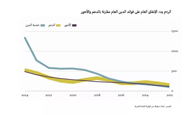 يتناقض هذا مع الوضع الحالي، إذ توجد علاقة عكسية بين ارتفاع معدّل نمو الإنفاق على فوائد الدين العام ونمو الإنفاق على الأجور أو الدعم، وذلك على الرغم من أن الدين العام لا يزال محليًا بالأساس.
