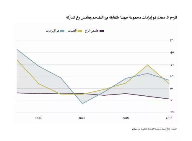 وكما يتضح من الشكل التالي، استطاعت "جهينة" أن تحقّق نموًا في مبيعاتها يتجاوز معدّلات التضخّم المرتفعة في خلال العقد الماضي، ما جاء عن طريق مزيج من رفع أسعار المنتجات بمعدلات مرتفعة والمراهنة على استمرار المستهلكين في الشراء بالمعدلات نفسها بالنظر إلى طبيعة منتجات الشركة وهي سلع أساسية صعب الاستغناء عنها، لكن حجم ما يتم اقتطاعه من هذه المبيعات، ويتجلّى في مؤشر هامش الربح، يبدو محدودًا، وقد ساهم في ذلك ارتفاع تكاليف الإنتاج بسبب الضغوط التضخمية في هذه الفترة.