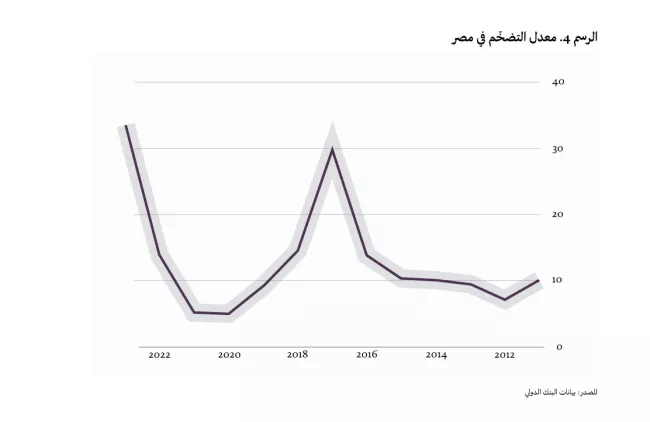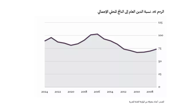 من جهة أخرى، شهد متوسط العائد على الدين العام صعودًا قويًا، ما يعكس نسبيًا التعرّض القوي للعولمة المالية في خلال السنوات الأخيرة ومن ثم الانتقال السريع إلى أثر ارتفاع الفائدة الأميركية إلى سوق الدين المحلي في مصر.