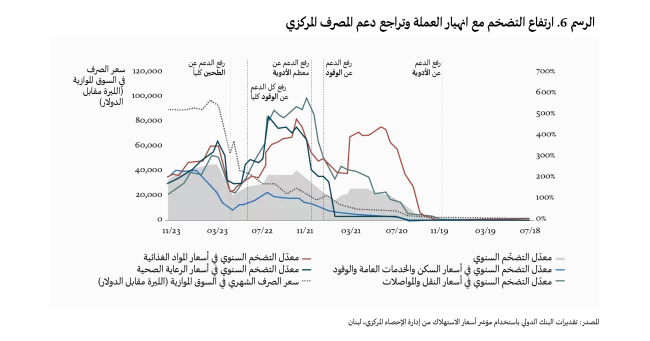 وأدّى الانخفاض السريع في قيمة الليرة اللبنانية التي خسرت 98% من قيمتها إلى تضخّم بلغ مستويات غير مسبوقة، فانفجرت معدّلاته من 3% في المتوسّط بين عامي 2011 و2018 إلى 85% في 2019، لتقفز بسرعة إلى 155% في عام 2020، مُسجلة 221% في 2023. وقد أصاب هذا التضخّم بشكل خاص الناس الأكثر فقرًا، إذ كان أشبه بضريبة تنازلية ألحقت أشدّ الضرر بأصحاب الدخل الثابت بالليرة اللبنانية. وكان ارتفاع التضخّم في أسعار السلع الغذائية أقوى، إذ زادت نسبته من 4% في عام 2019 إلى 254% في 2020، وظلّ ثلاثي الأرقام حتى عام 2023.