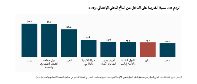 سجّل لبنان طوال سنين مستوى منخفضًا في نسبة الإيرادات الضريبية من إجمالي الناتج المحلي. قبل أزمة 2019، كانت الإيرادات الضريبية تشكّل نحو 14% من الناتج المحلي الإجمالي، وهي نسبة أقل بكثير من المتوسط مقارنة بالدول متوسطة الدخل (20-25%).
