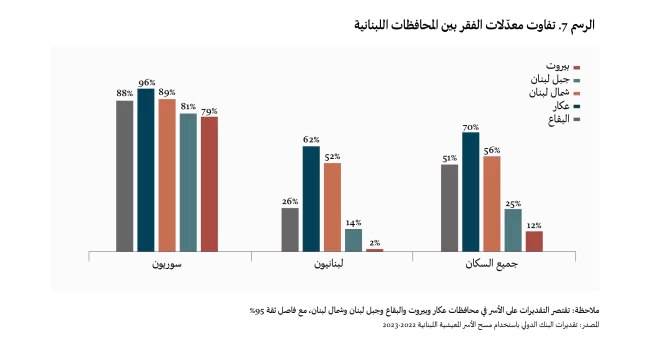 ووفقًا لتقرير أعدّه البنك الدولي، يعاني اللاجئون السوريون في لبنان من معدّلات فقر مدقع، تصل إلى 79% في بيروت وإلى 96% في عكار، وهي نسبة أعلى بكثير مقارنة باللبنانيين. كما أن الفجوات في الدخل بين المجموعتين كبيرة أيضًا: يكسب العمّال اللبنانيون في المتوسط 60% أكثر من السوريين. ويظل هذا الاختلاف قائمًا حتى في القطاعات التي لا تتطلّب مهارات عالية مثل الزراعة أو الأشغال الأولية.