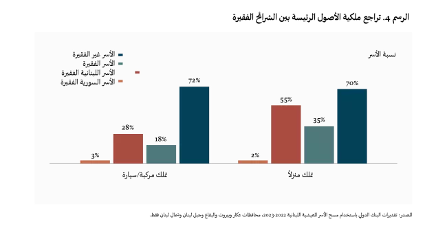 وتظهر دراسة البنك الدولي أيضًا لا مساواة في الوصول إلى الموارد وفرص العمل، وذلك من خلال البيانات المتعلّقة بملكية الأصول، تحديدًا السكن والسيارات. وفي حين أن نحو 3 من كل 5 أسر تمتلك منزلها، فإن 35% فقط من الأسر الفقيرة تمتلك منزلها، وهو نصف معدل الأسر الميسورة. وترتفع هذه النسبة بين الأسر اللبنانية الفقيرة (55%)، في حين أن الأسر السورية الفقيرة مُستبعدة بشكل شبه كامل من ملكية العقارات. أمّا بالنسبة إلى السيارات، التي تشكّل أصلًا أهمّية بالغة في بلد تتراجع فيه كل وسائل النقل العام، فإن 72% من الأسر غير الفقيرة تمتلك سيارة. وينخفض هذا الرقم إلى 28% للأسر اللبنانية الفقيرة و3% فقط للأسر السورية الفقيرة.