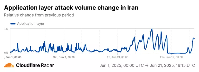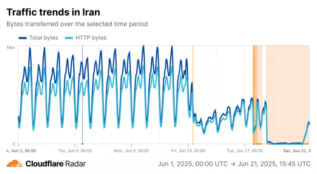 تؤكد أيضًا بيانات Cloudflare Radar هذه التحولات من زاوية أخرى، من خلال تتبع حجم البيانات المتبادلة عبر الإنترنت داخل إيران. مع الهجوم العسكري، انخفض حجم البيانات بشكل حاد. واستمر التراجع حتى يوم 16، ثم دخلت الشبكة مرحلة اضطراب شديد في 17 و18، وشهد 17 يونيو انقطاعات متقطّعة (ثلاثة شرائط برتقالية)، أمّا الانقطاع شبه الكامل فبدأ مساء 18 يونيو، قبل أن تنهار فعليًا في 19 يونيو، في ما يُعرف بالانقطاع شبه الكامل (Near-total Blackout).