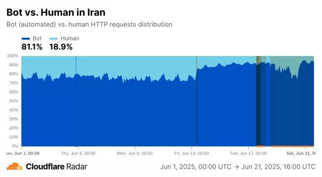 ارتفاع نسبة حركة البوتات بهذا الشكل الحاد لا يمكن قراءته إلا علامة على أحد الاحتمالات؛ إما أن الدولة الإيرانية منعت فعليًا أي اتصال بشري، تاركة المجال مفتوحًا فقط للأنظمة الأمنية والمؤسساتية، أو أن الشبكة كانت تعمل فقط على المستوى الخلفي، إذ تظل العمليات التقنية مستمرة دون إتاحة الوصول للمواطنين.