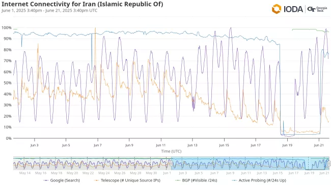 كل ذلك يشير إلى استعداد حكومي لتقييد الاتصال كإجراء دفاعي، إما بهدف حجب مواقع أو خدمات أو منع تسريب بيانات المستخدمين داخل إيران، أو لتأمين البنية السيبرانية من الهجمات. وفي 18- 19 يونيو انهار الإنترنت تقريبًا، إذ وصلت المؤشرات البنفسجية والبرتقالية والزرقاء إلى مستويات قريبة من الصفر.