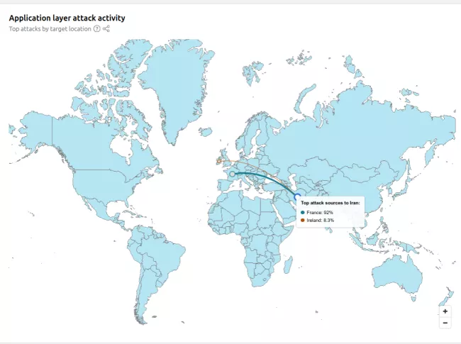 تُظهر هذه الخريطة الصادرة عن Cloudflare Radar النشاط الرقمي الذي استهدف إيران في طبقة التطبيقات، والذي يأتي من عناوين IP يُسنَد موقعها إلى فرنسا (نحو 92%) تليها أيرلندا (نحو 8.3%).