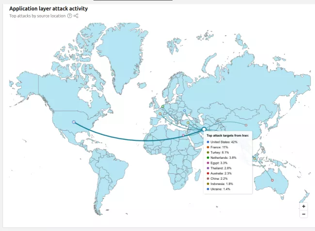 تعرض هذه الخريطة من Cloudflare Radar الوجهات الجغرافية التي استهدفتها الهجمات الرقمية المنطلقة من إيران، تحديدًا تلك التي ركزت على طبقة التطبيقات.