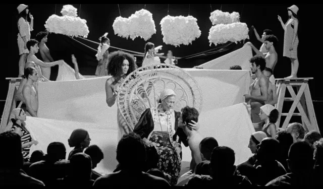 https://youtu.be/EyXabPZTogg?si=qZ1oS1w_O76PB7piيحكم هذه المستعمرة بهلوان جسَّده الفنان أحمد كمال، يقدم عروضًا يفرض على الجمهور فيها أن يضحك عنوةً وأن يصفّق قسرًا. ورغم مأساوية عروض "الفزيون"؛ المسرح الذي يقدم عليه البهلوان فقراته، حلم كل مواطن في هذه المستعمرة بالمشاركة فيها، ومن بينهم عبده/عمر رزيق، ذلك الشاب اليافع، الفنان، الذي يقدم موسيقى بوسائل بدائية لكنها خلاقة ومبدعة، ويحظى برعاية ومحبة خاصة من سيدة البازار/منحة البطرواي، نستشعر فيهما بعدًا روحيًا ميتافيزيقيًا وكأنها العرابة وهو "المختار".