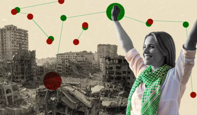 المفارقة هنا، أن النوعين المتناقضين من المشاهد امتزجا في منطقة ما، حيث تحضر استعارة الدم والتذكير به، في أجواء من الاسترخاء، أو الاحتفال، أو الكرنفالية، مع الابتسامات والضحك والأناقة، وربما الإغواء والعلاقات التي تنشأ بين الناشطين والناشطات، والحديث خلال تظاهرات التضامن عن أي شيء، وليس بالضرورة عن فلسطين. وكأنه مفتتح عملية استخدام أدوات عصرية تناسب العالم السطحي المهتم بالصورة، والمهووس بتجميل المحتوى. أدوات كانت قبل قليل حكرًا على قوى اليمين والطبقات العليا الحاكمة.