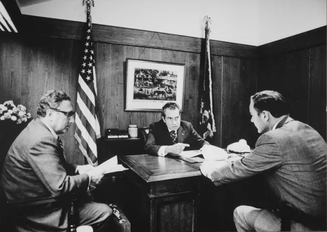 الرئيس الأمريكي ريتشارد نيكسون يناقش الوضع في فيتنام مع هنري كيسنجر (على اليسار) وألكسندر هيج، كامب ديفيد، نوفمبر 1972