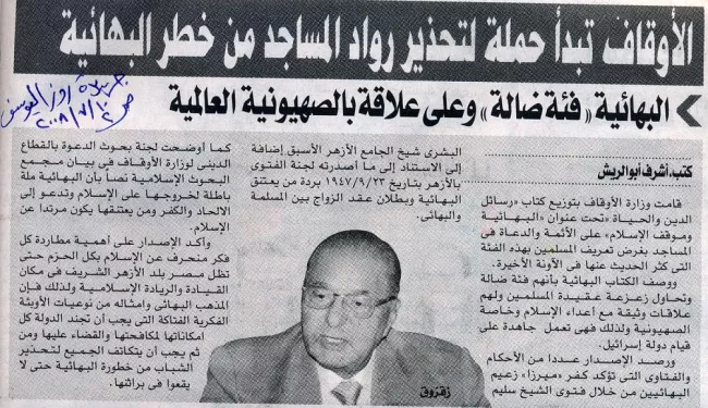 استصدر الأساتذة المعترضون على تعيين بهائية في منصب أكاديمي من الأزهر بيانًا بتكفير البهائيين. وفي يناير/كانون الثاني 1986 نشرت جريدة عقيدتي التابعة لمؤسسة أخبار اليوم بيان مجمع البحوث الإسلامية "المندد بالدعوة البهائية"، مُستدلًا بما واجهه أتباعها من "قتل وتنكيل" من المسلمين.