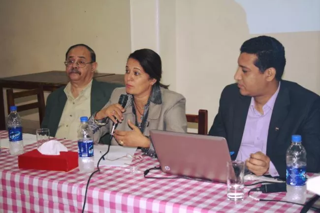 باسمة موسى في إحدى الندوات وإلى جوارها منير مجاهد