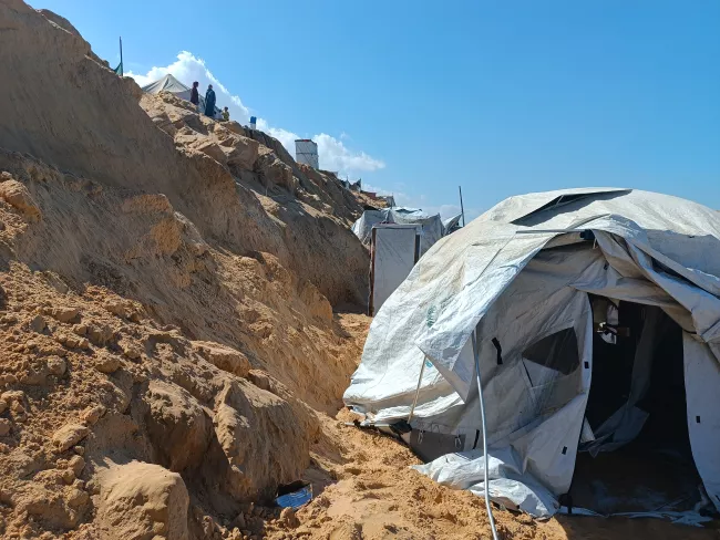 إحدى خيام الجرف الساحلي في منطقة مواصي القرارة شمال غرب مدينة خانيونس جنوب قطاع غزة، أكتوبر 2025.