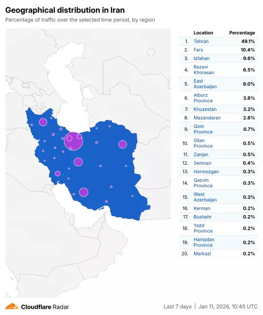 وتُظهر بيانات أخرى من Cloudflare Radar أن حركة الإنترنت التي رصدتها المنصة كانت متركزة جغرافيًا بشكل كبير في عدد محدود من المحافظات، وعلى رأسها طهران. ووفق رسم التوزيع الجغرافي لحركة الإنترنت في إيران (خلال آخر 7 أيام حتى 11 يناير 2026، 10:45 بتوقيت UTC)، استحوذت طهران وحدها على 49.1% من إجمالي الحركة التي التقطتها Cloudflare خلال الفترة، أي ما يقارب نصف النشاط المرصود على مستوى البلاد.