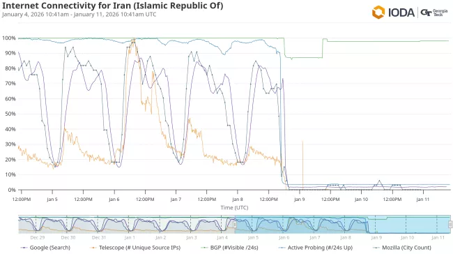 في الأزمة الراهنة، أشارت بيانات المنصتين إلى انقطاع واسع في اتصال الإنترنت داخل إيران بدأ عصر الخميس 8 يناير/كانون الثاني الحالي، قبل أن يهبط النشاط إلى مستويات شديدة الانخفاض خلال المساء بتوقيت جرينتش، وفق رسوم تتبع حركة الاستخدام والاتصال على مدار الأيام الماضية.